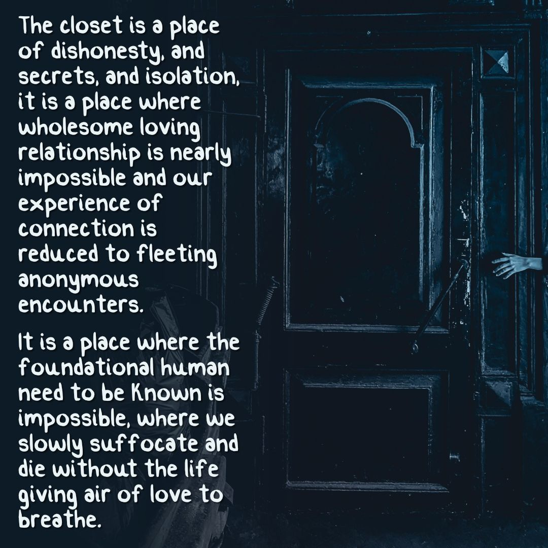 The closet is a place of dishonesty, and secrets, and isolation, it is a place where wholesome loving relationship is nearly impossible and our experience of connection is reduced to fleeting anonymous encounters.